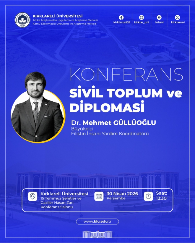 Üniversitemiz Afrika Araştırmaları Uygulama ve Araştırma Merkezi ile Kamu Diplomasisi Uygulama ve Araştırma Merkezi tarafından, “Sivil Toplum ve Diplomasi” konu başlıklı konferans düzenlenecektir.